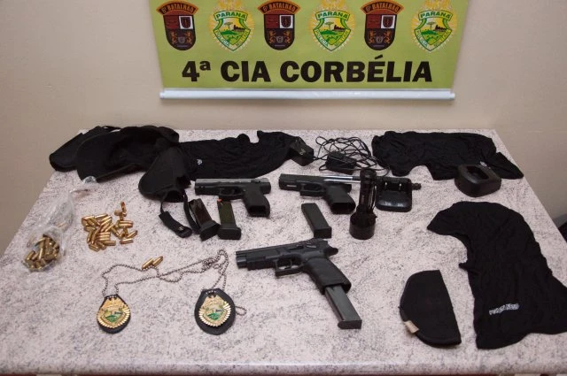Após uma denúncia anonima, Polícia Militar de Corbélia foi informada que um veículo Vectra Preto, usado em um assalto a onibus no último domingo, estava escondido na zona rural do distrito de Ouro Verde do Piquiri, Com ordem do Comandante da Companhia equipes foram deslocadas para o local onde foi confirmado o fato, no primeiro momento não foi identificado nada ilegal, mas através de uma vistoria minunciosa no veículo, foram encontradas em uma mochila, armas, munições, tocas e distintivos da Polícia Militar. o Veículo apreendido foi encaminhado até a sede da policia militar de Corbélia e com apoio da Polícia Civil de Cascavel GDE foram ancaminhados a Cascavel e prosseguirão as diligencias em buscados autores do crime.